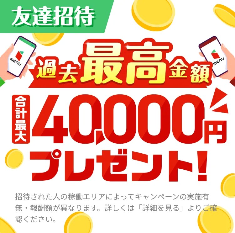 新規エリア拡大記念キャンペーンで最大40,000円、友達招待キャンペーンで最大25,000円(期間:2/17まで)という前代未聞の大盤振る舞いなので、新規拡大対象エリアに住んでいる人は大チャンスです!