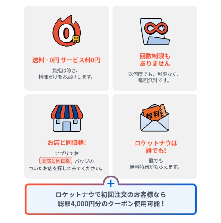 ロケットナウは他のフードデリバリーに比べてかなりお得に利用できるので、少しでも安く注文したい人にとって最有力アプリといって間違いないでしょう。
