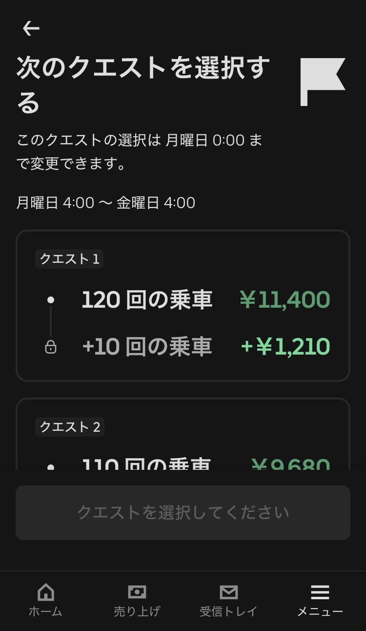 これまで自動で割り当てられていた週次クエストが、Uber Driverアプリ内で自分で選べるようになります。