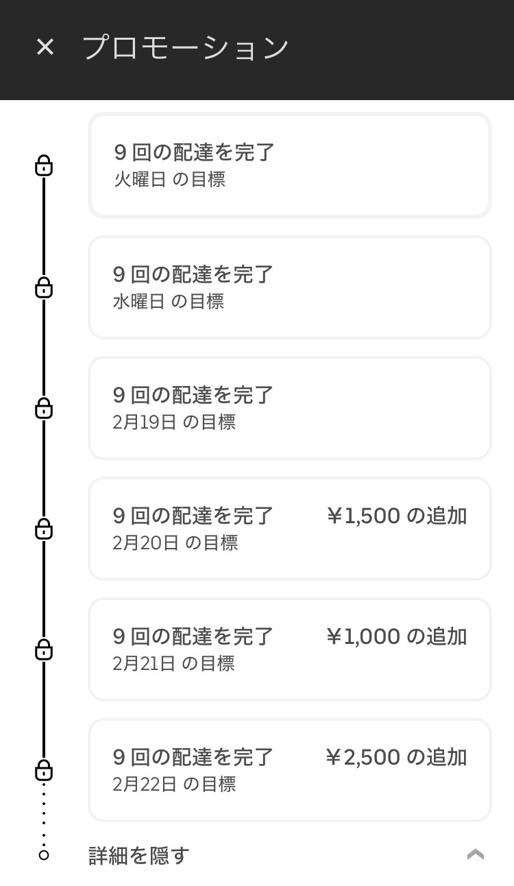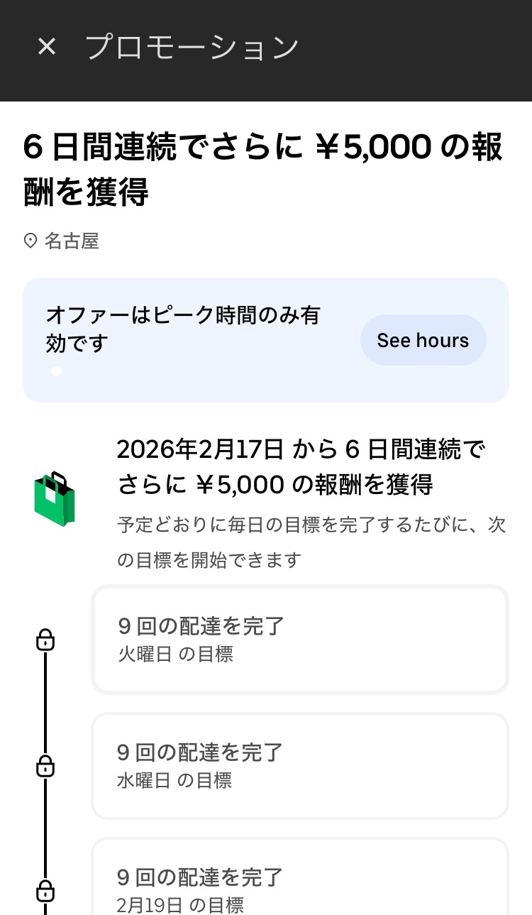ひとつの例としては、ピークタイムに9回配達を6日間達成し続けると、4日目に1500円、5日目に1000円、6日目に2500円、という条件を提示されました。
