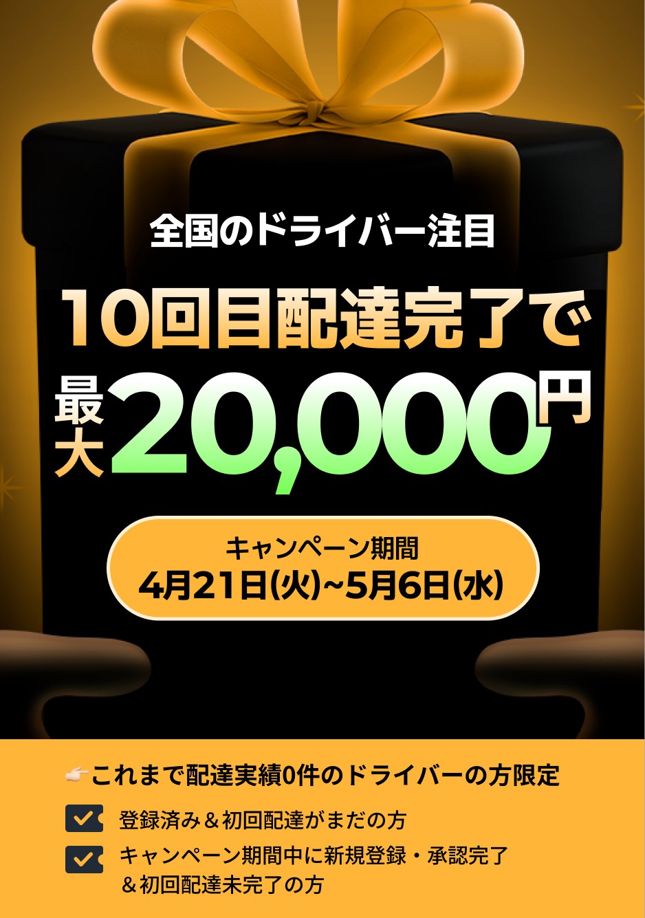 - 全国対象!新規ドライバー10回配達で20,000円ボーナス(4/21~5/6)