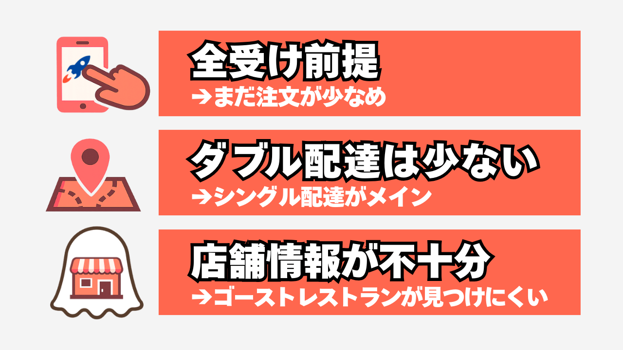 Uber Eats で厳選やキャンセルしないといけないのって、内容に対して報酬が安すぎたり、無茶苦茶なルートでダブルを組まれるからです。そのような判断や操作をせずに配達に集中できるのはむしろメリットと言えるかもしれません。