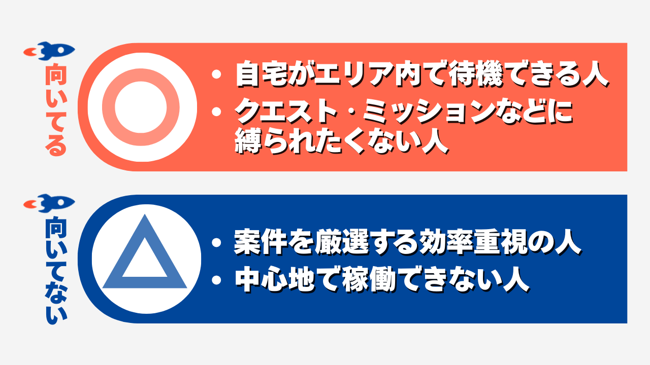 基本的に待ちの戦略になるので、自宅がエリア内で待機できる人は向いています。鳴るまで家事や別の作業をしつつ、鳴ったら出動というスタイルと相性がいいです。