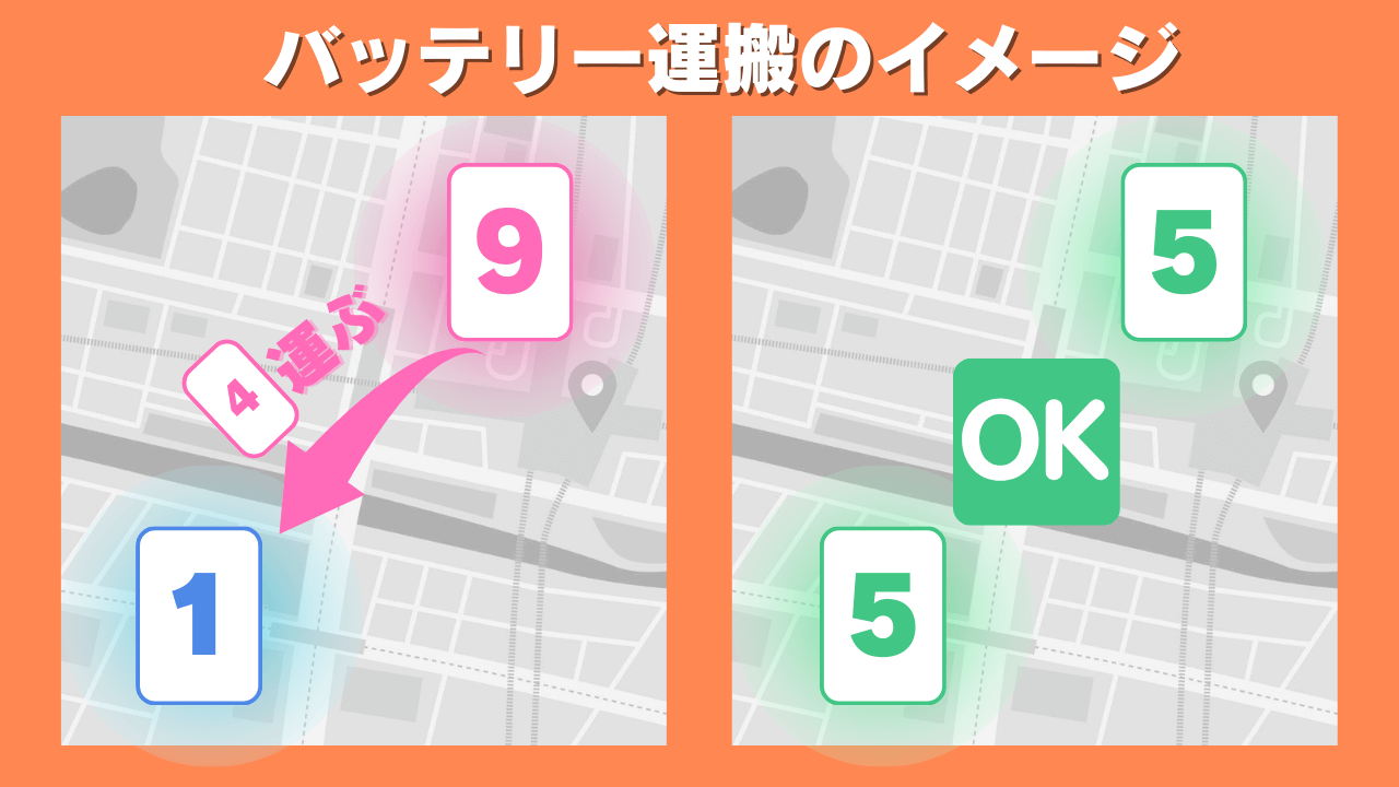 この偏りを解消するために、SPOTJOBSに登録している人がバッテリーが余っている場所から不足している場所へ運ぶわけです。