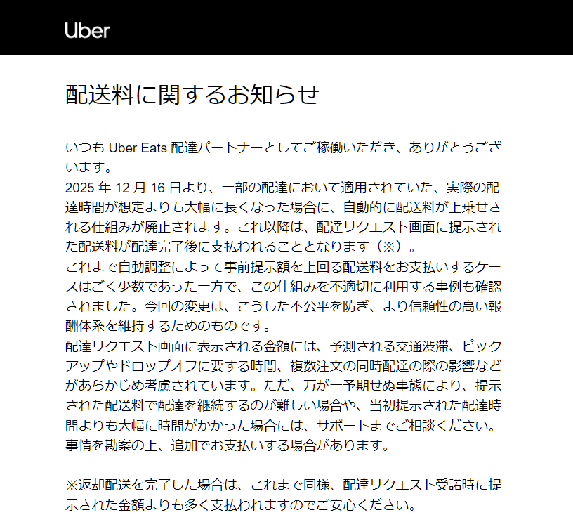2025年12月1日、Uber から「配達料に関するお知らせ」というメールが送られてきました。