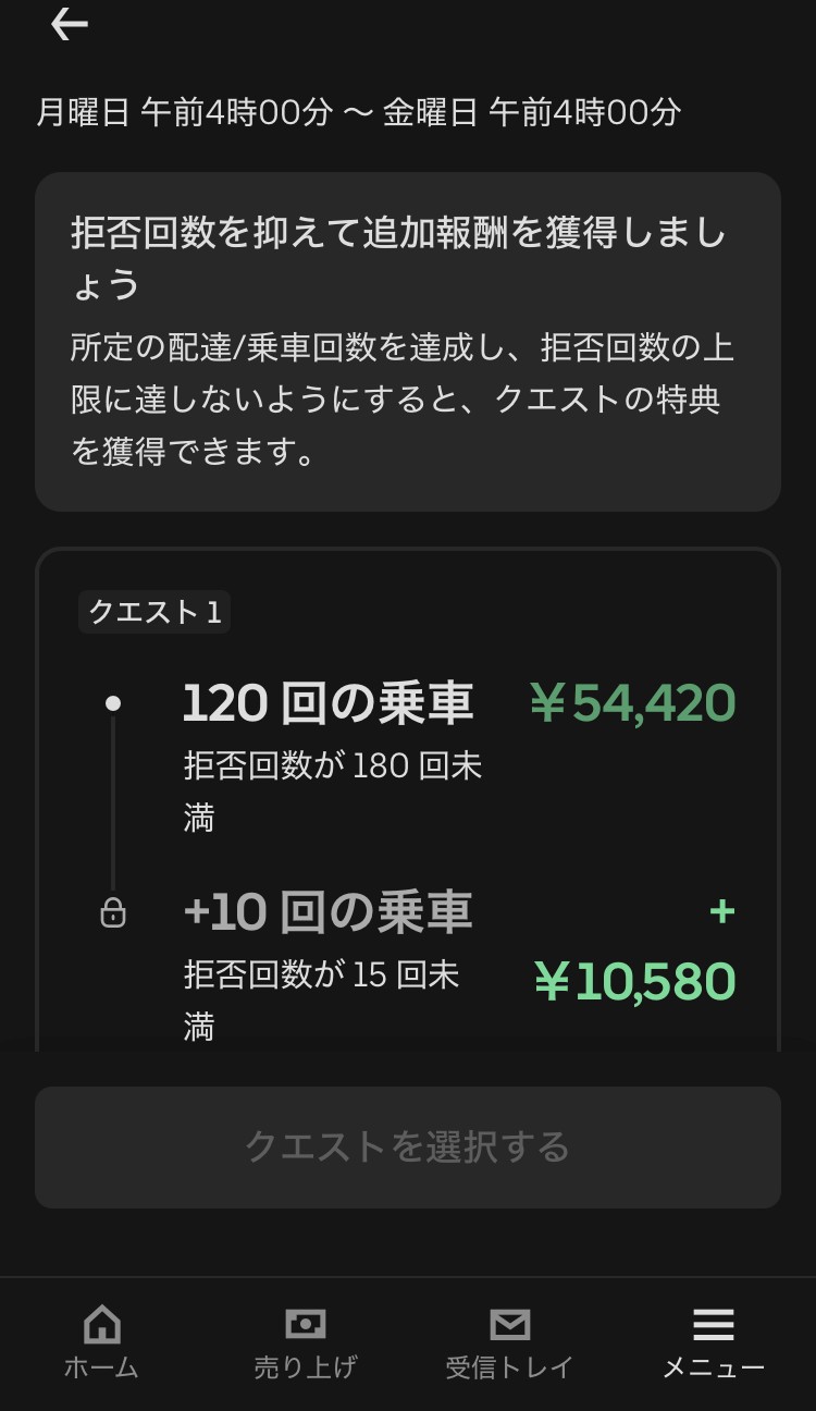 今回のクエスト試験運用では、追加インセンティブの獲得に関する条件として、配達リクエストの拒否回数の上限が設定されます。